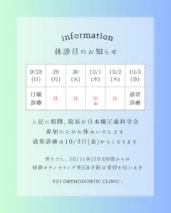 9/29(月)~10/2(木)の4日間は、院長が日本矯正歯科学会参加のため休診日となっています。